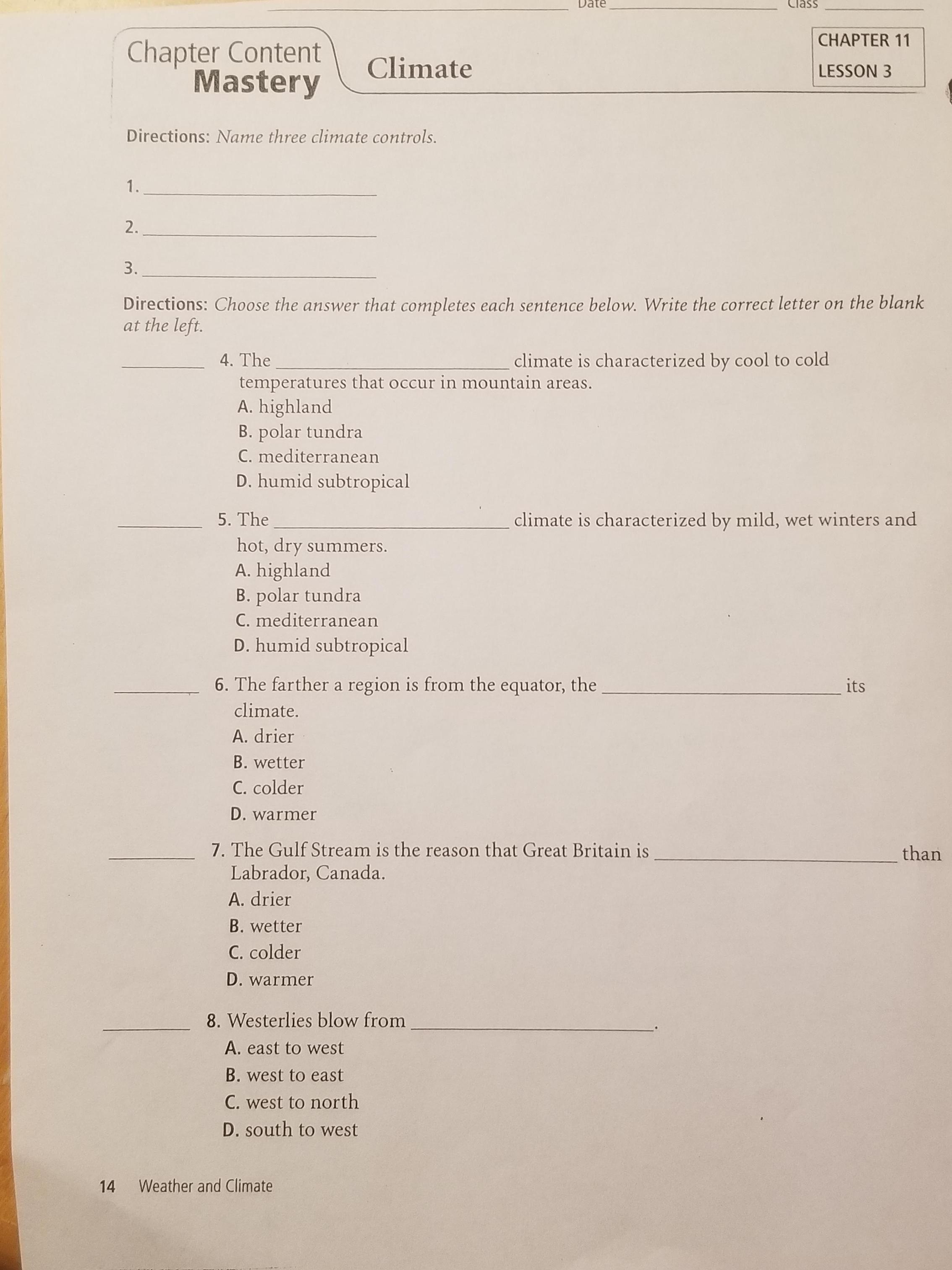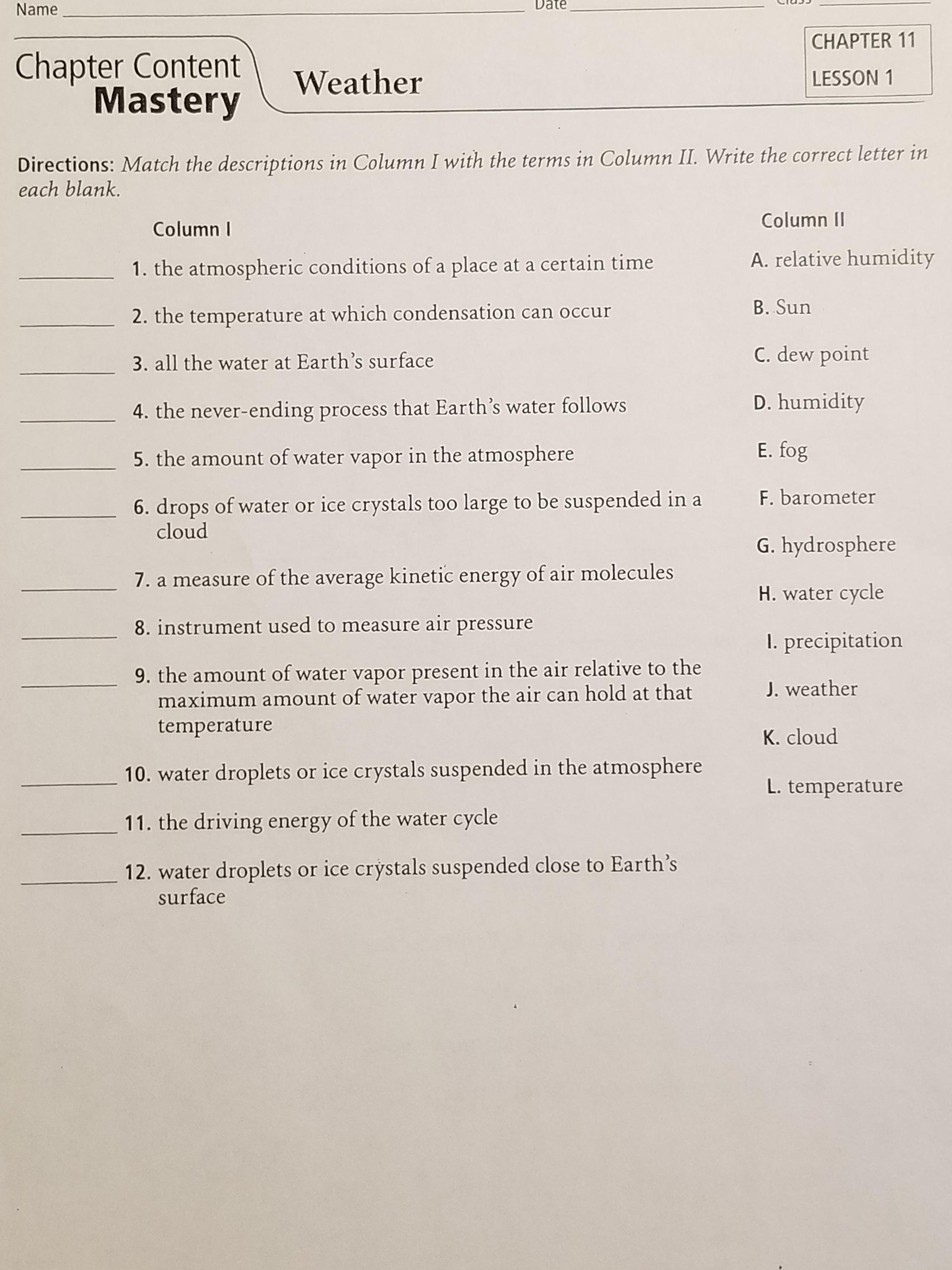 Perform Chapter Content Mastery worksheets on weather. If you don't have a packet or can't download, respond by using your composition books and write the title of the assignment at the top of the page. See attached